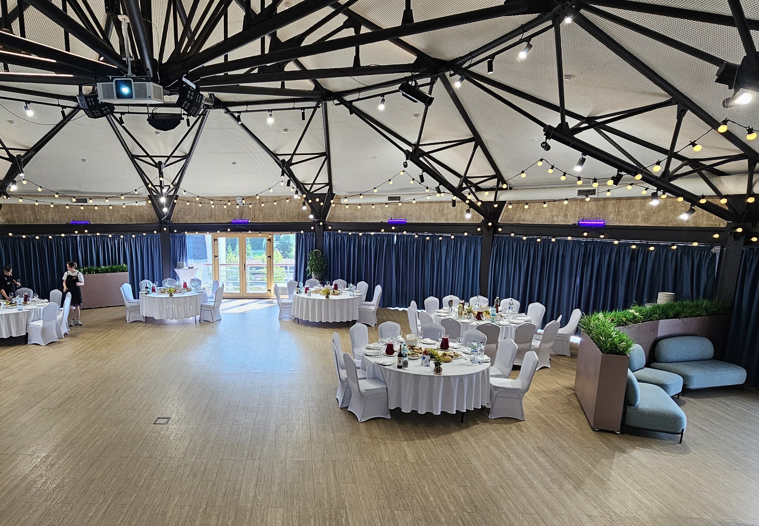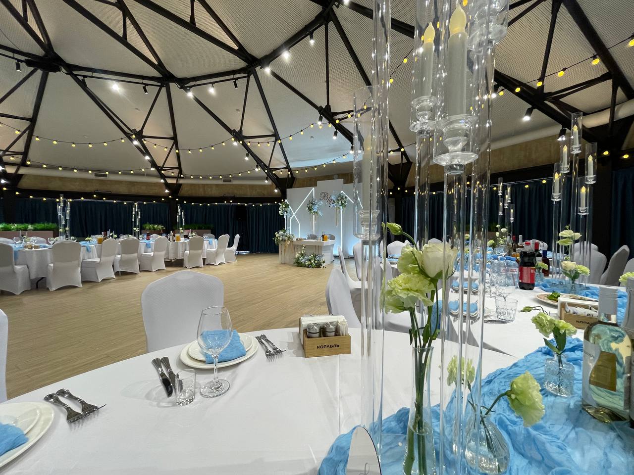 Банкетный зал Галактика впечатляет своими размерами: площадь зала 250 м2, высота купола от 3,5 до 5 м. Вместимость 200-250 человек в режиме конференц-зала и 200 человек в режиме банкета.