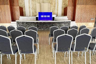 Зал оборудован профессиональной саунд-системой и базовым световым оборудованием. Система штор блэкаут дает возможность полностью затемнить зал для лучшей работы проектора.