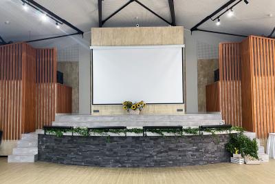 В зале расположена сцена с большим подъемным экраном и мощным проектором.